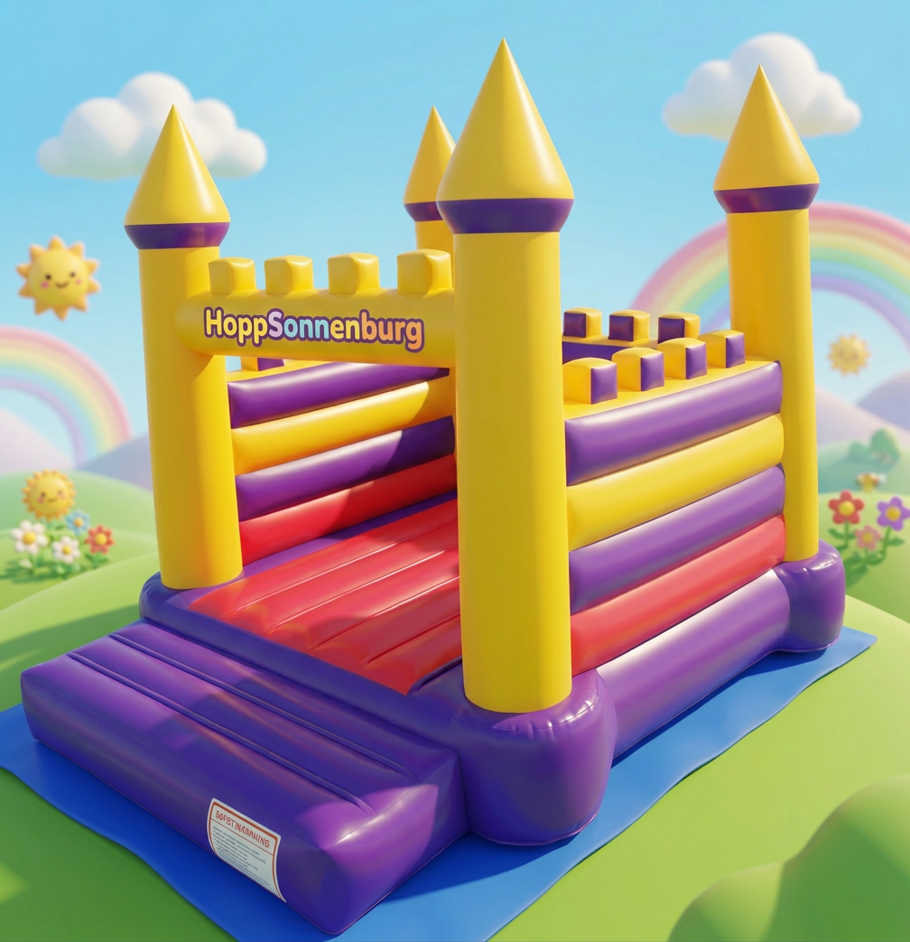 Die HoppSonnenburg ist eine zauberhafte Hüpfburg im Schloss-Design mit Türmchen und freundlichen Farben – ein echter Hingucker für kleine Prinzessinnen und Ritter auf Kinderfesten. Sie bietet eine Sprungfläche von 3x2,80 m für bis zu 9 Kinder (bis 1,50 m) und passt dank kompakter Maße (4,80x4,10x3,90 m) perfekt in normale Gärten.
